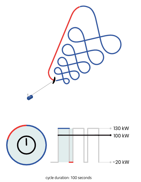 Hur fungerar Kitepower Falcon? Elproduktionen fungerar i tvĂ„ faser som Ă€r âreel outâ (producerar energi) och âreel inâ (förbrukning av energin). I fas ett genereras energi nĂ€r draken flygs i sidvind i formen av en Ă„tta för att uppnĂ„ en hög dragkraft och rulla ut vajern frĂ„n vinschen. Under denna fas producerar Kitepower Falcon 130 kW under 80 % av cykelns tid.