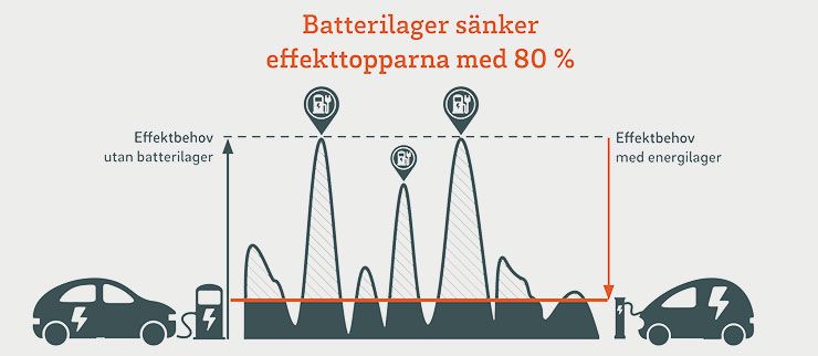 Vid högt effektuttag kan batterier balansera systemet, exempelvis pÄ morgonen nÀr industrin kör igÄng och kaffebryggare och bilvÀrmare gÄr varma, men ocksÄ stötta systemet om det sker ett oförutsett strömbortfall och minska behovet av fossil effektreserv.