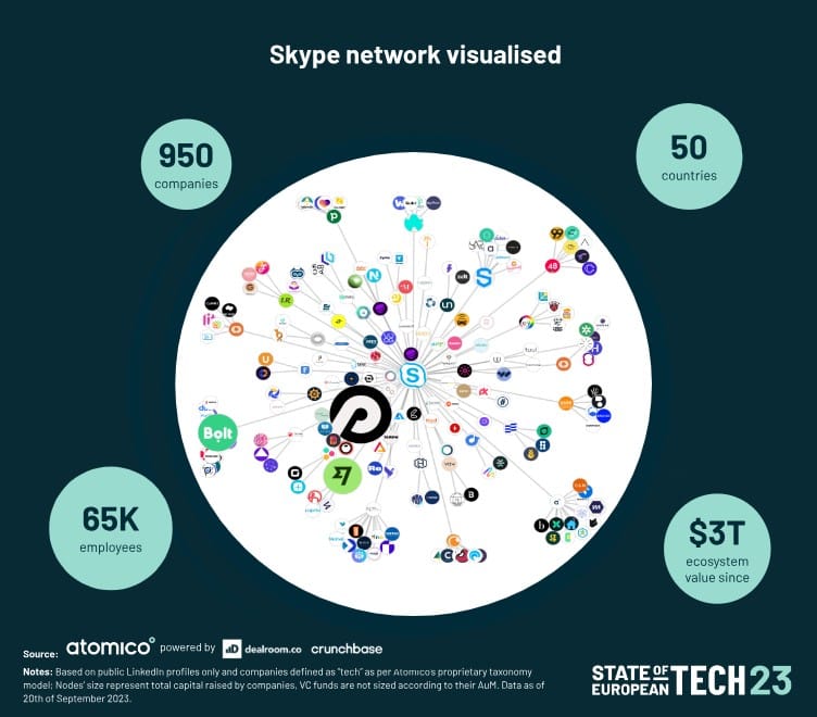 Betydelsen av Skype Àr stor. Som förebild, men ocksÄ katalysator till hundratals andra startups. Alumnis frÄn Skype har startat 950 bolag, i 50 lÀnder, som har 65 000 anstÀllda och ett ekosystemsvÀrde pÄ över 30 000 miljarder kronor.