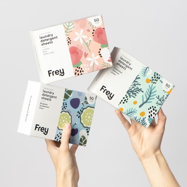 Frey valde att göra sitt tvÀttmedel i form av tunna ark eftersom det helt eliminerar vatten och plast. Deras ark Àr gjorda av naturligt framstÀllda ingredienser och de tillsÀtter stÀrkelse och proteiner för att hÄlla ihop de tunna arken. De löses senare upp helt i tvÀttmaskinen. Produkten Àr förpackad i smÄ kartonger med en pÄse av komposterbar plast för att skydda produkten.