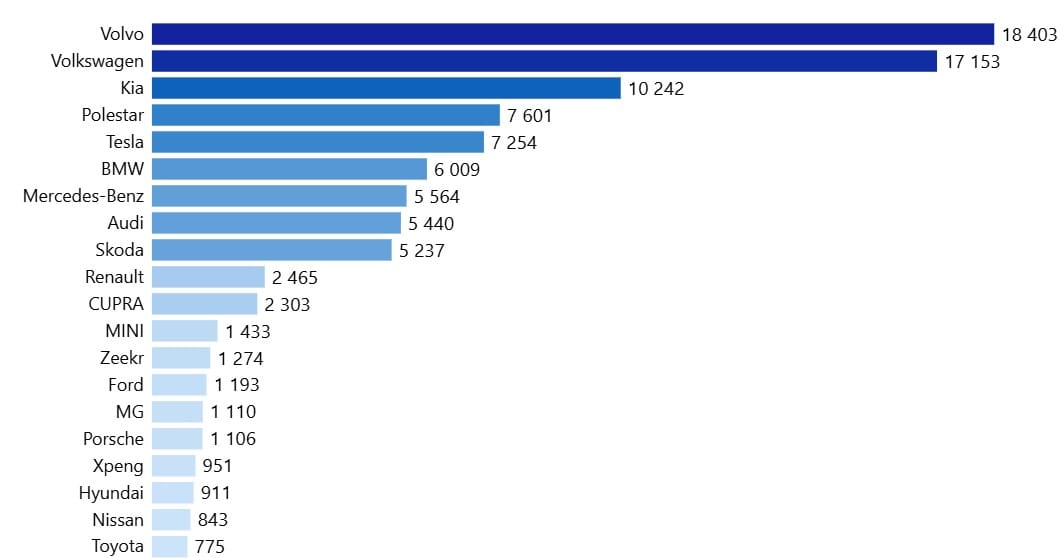 BÀst sÀljande mÀrke blev Volvo, före Volkswagen och Kia. Tesla tappade 2024 Ärs förstaplats och hamnade nu pÄ plats fem.