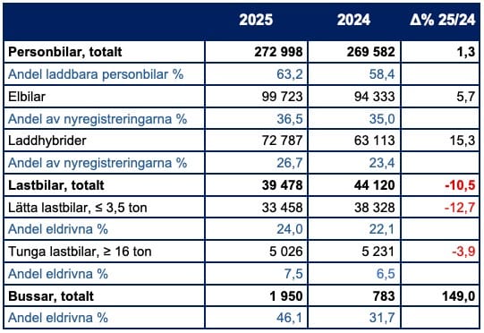 Under 2025 sĂ„ldes 99 723, vilken Ă€r en ökning med 5,7 procent jĂ€mfört med Ă„ret innan. Ăven andelen elbilar ökade, frĂ„n 35 till 36,5 procent.