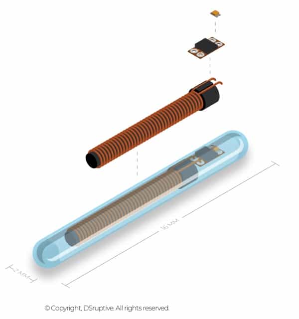 SjÀlva kretsen finns i ett implantat som Àr nÄgot större Àn ett riskorn med sina 16 millimeter i lÀngd.