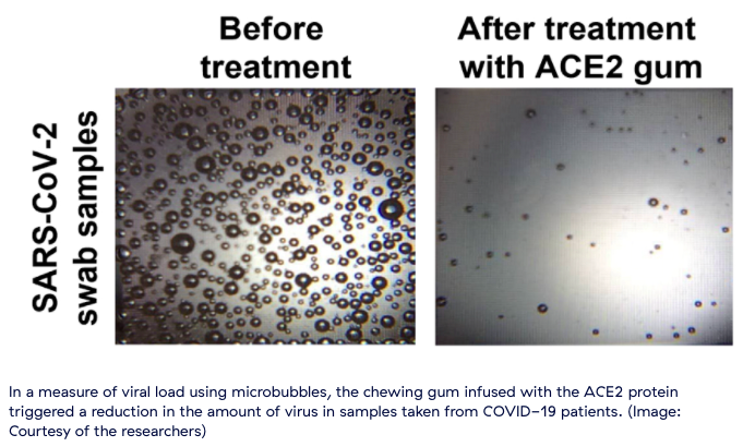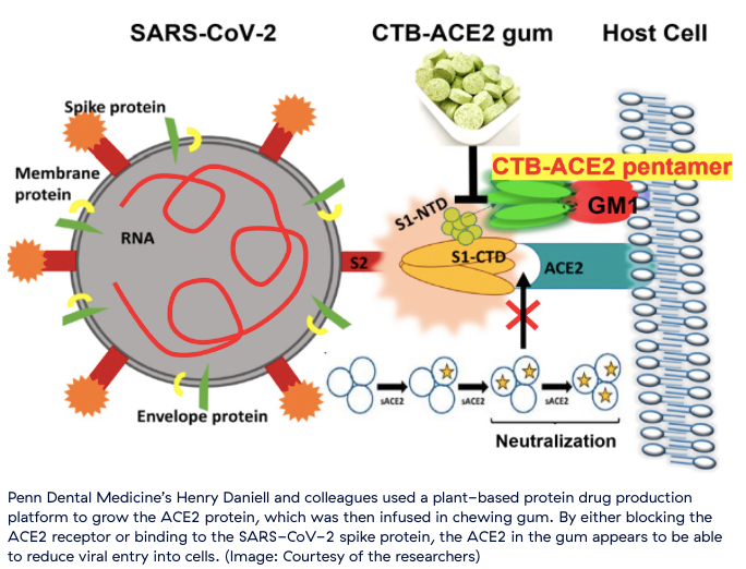 Grace C. Roberts frÄn The Conversation beskriver att forskarna bakom tuggummit anvÀnde vÀxtbaserade ACE2-proteiner. Varför? De tror att viruspartiklar kommer att haka fast pÄ tuggummits ACE2-receptorer och dÀrmed minimeras virusets förmÄga att spridas frÄn mun till mun.