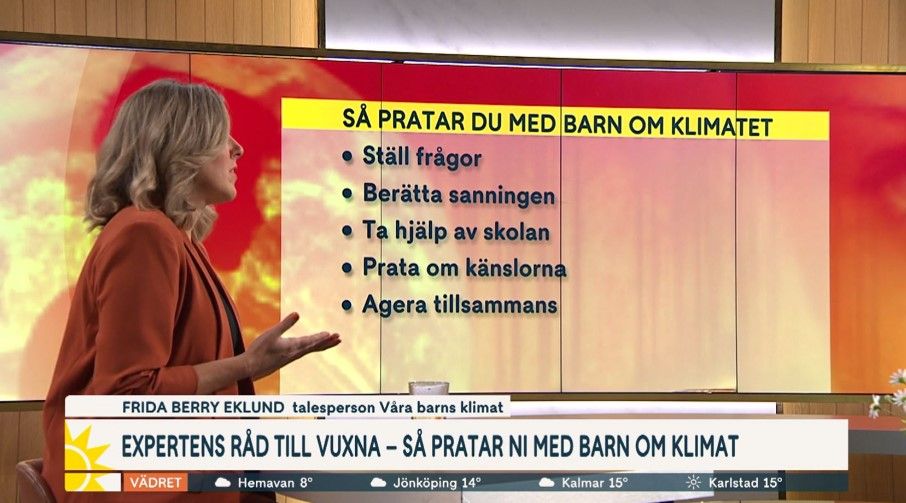 För oroliga förĂ€ldrar finns givetvis en uppsjö av artiklar och inslag pĂ„ temat âHur du pratar med ditt barn om klimatet.â Jag gör en sökning och hamnar pĂ„ sajten Motherhood dĂ€r det âĂ„ngestladdadeâ Ă€mnet presenteras tillsammans med â5 mĂ€ktiga citat frĂ„n Greta Thunbergâ, inklusive klassikern, âJag vill inte att ni ska vara hoppfulla. Jag vill att ni ska ha panikâŠâ NĂ€sta stopp blir TV4 Nyhetsmorgon som valt en bild pĂ„ ett brinnande inferno som bakgrund för sitt inslag om klimatprat med barn (âBerĂ€tta sanningenâ âPrata om kĂ€nslornaâ).