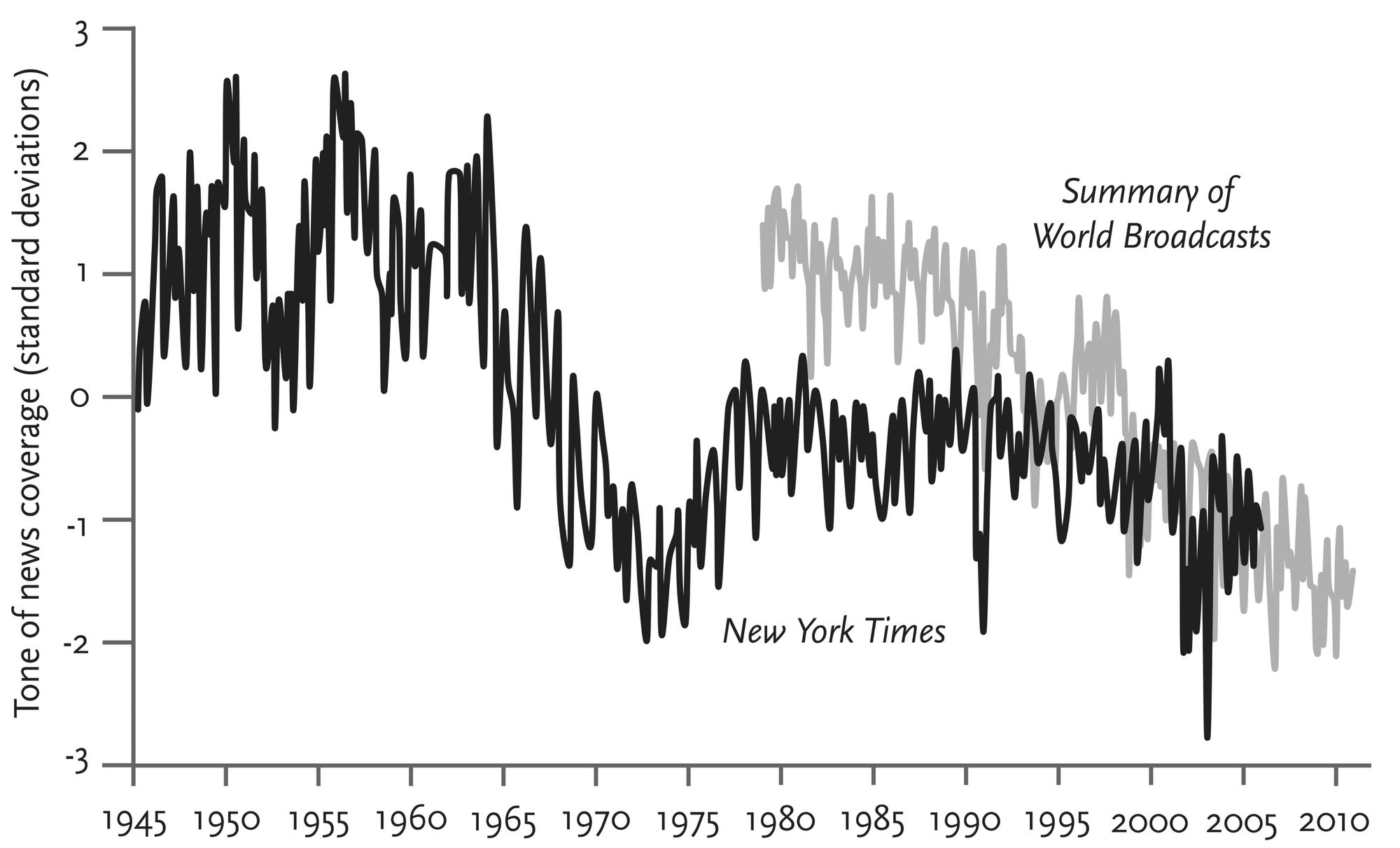 Typ den enda graf som Àr negativ i Pinkers bok Àr den om tonen i nyhetsmedia. Som Àr allt mer negativ över tid.