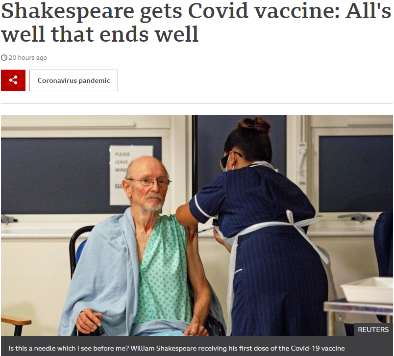 Andra personen, och första mannen, att bli vaccinerad för Covid19 i Storbritannien heter ... William Shakespeare.
