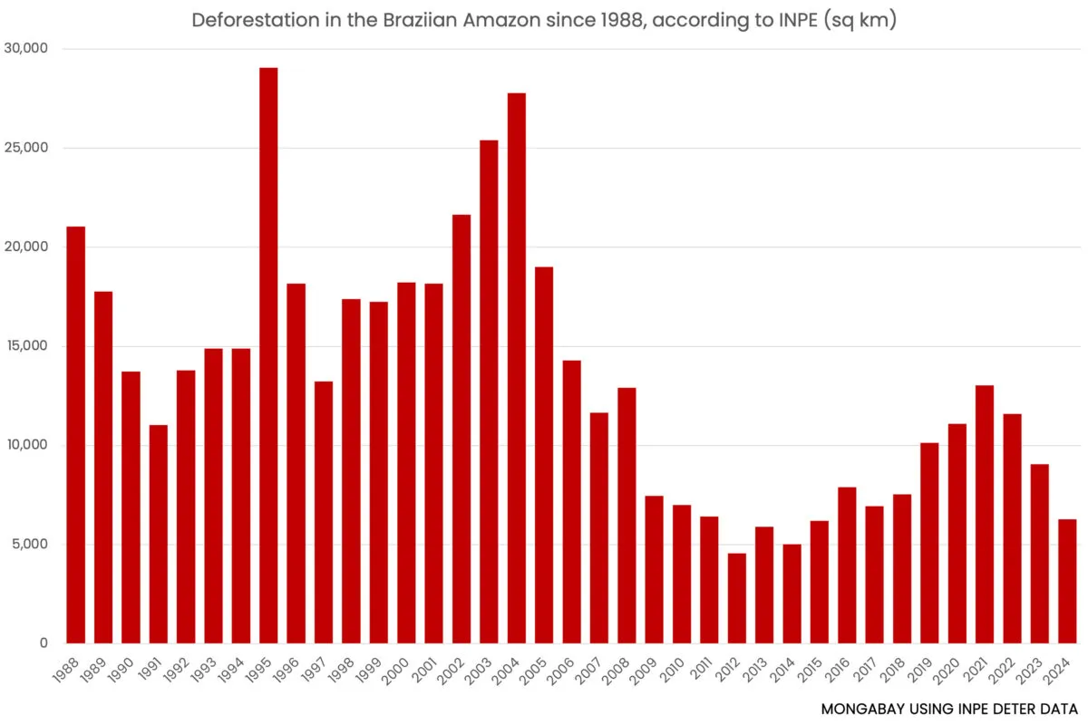 Separata Ärsdata stÀrker bilden. INPE:s PRODES-system, som anvÀnder högupplösta satellitbilder för att ta fram officiella Ärssiffror, visade att avskogningen under de tolv mÄnaderna fram till juli 2025 sjönk med elva procent till 5 796 kvadratkilometer. Det Àr den lÀgsta nivÄn pÄ elva Är.