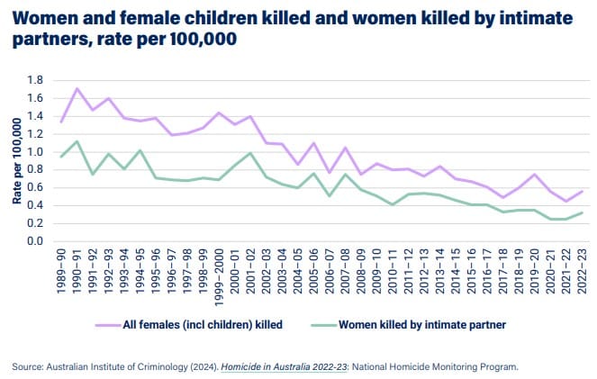 En sÀrskilt positiv utveckling Àr den markanta minskningen av antalet kvinnor som dödas av nuvarande eller tidigare partner. Sedan 1989-90 har denna siffra sjunkit frÄn 0,95 per 100 000 till 0,32 per 100 000 under 2022-23. Detta representerar en betydande nedgÄng över de senaste tre decennierna.