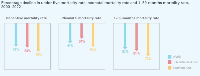 Trots dessa framsteg dog uppskattningsvis 4,9 miljoner barn under fem Är under 2022, varav 2,3 miljoner under sin första levnadsmÄnad. Dessa dödsfall beror ofta komplikationer i samband med förlossning och för tidig födsel, som kan hanteras om det finns fungerande vÄrd.