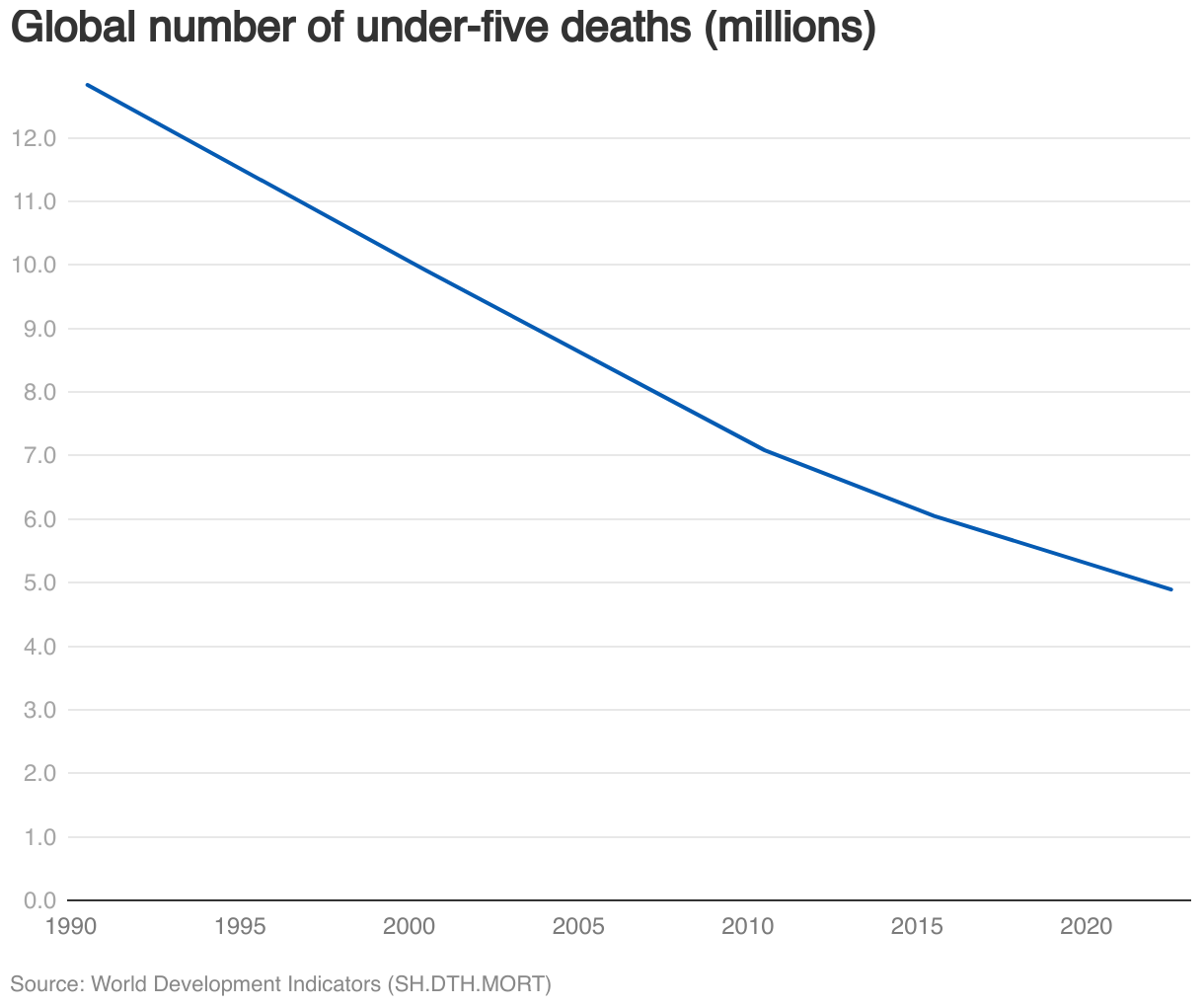 En nyligen publicerad rapport frÄn FN visar att antalet barn som dör före fem Ärs Älder globalt sjönk till under 5 miljoner för första gÄngen. Sedan Är 2000 har den globala dödligheten för barn under fem Är mer Àn halverats, frÄn 76 per 1 000 levande födslar till 37 per 1 000 levande födslar.