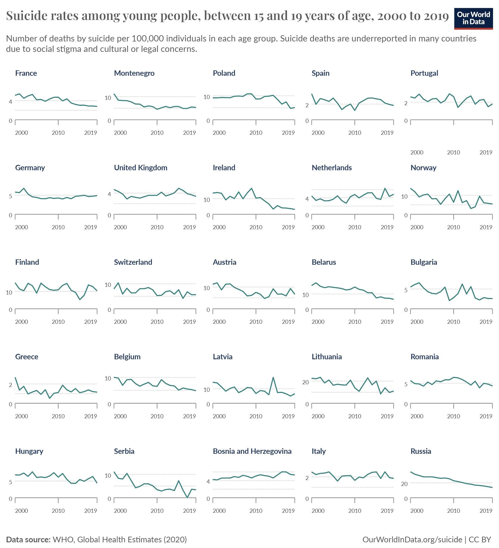 Under de senaste tvÄ decennierna har sjÀlvmordstal bland ungdomar i Äldrarna 15 till 19 Är visat pÄ en tydlig nedgÄng i mÄnga europeiska lÀnder. Detta framgÄr av en genomgÄng av statistik frÄn VÀrldshÀlsoorganisationen publicerad av Our World in Data.