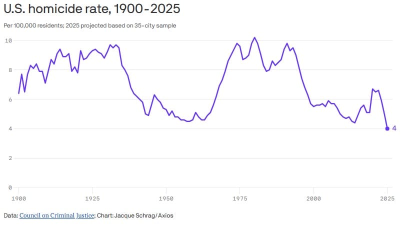 Mordsiffrorna i 35 stora amerikanska städer sjönk med 21 procent under 2025, den största minskningen på ett år som någonsin uppmätts. Mordfrekvensen på 4 per 100 000 invånare, vilket troligen var den lägsta nivån sedan 1900. 11 av 13 övervakade brottskategorier minskade jämfört med föregående år.