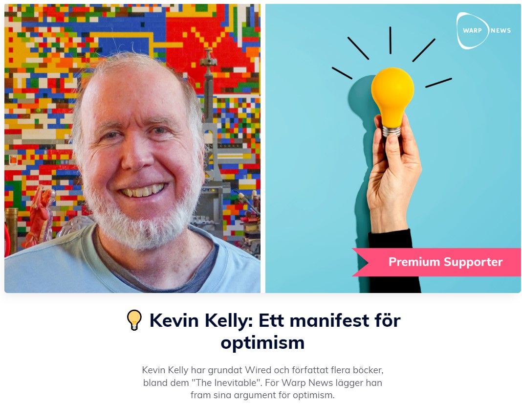 Citatet Àr frÄn Ett manifest för optimism, som Kevin Kelly skrivit för oss hÀr pÄ Warp News. Kelly Àr en av grundare till Wired och författare till flera inflytelserika böcker om teknologi, dÀribland The Inevitable.