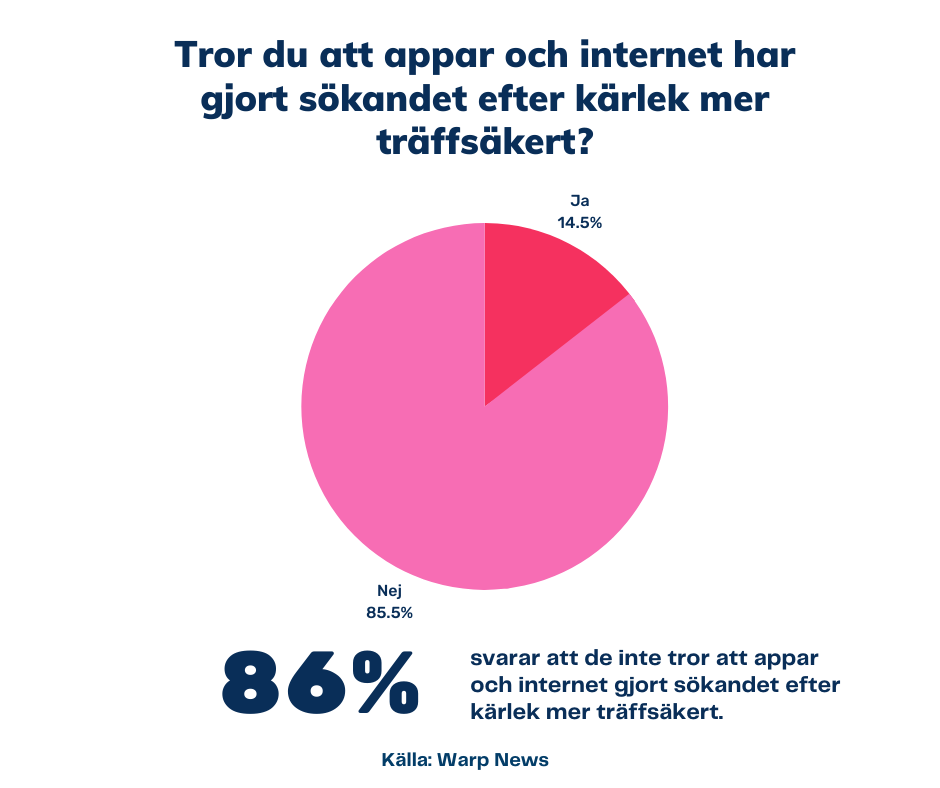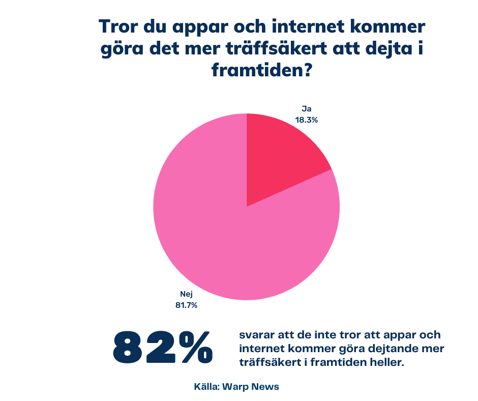 I Warps undersökning svarar 82 procent att de inte tror att appar och internet kommer att göra det lĂ€ttare att hitta rĂ€tt i kĂ€rleken. 86 procent svarar att de inte tror att appar gjort det mer trĂ€ffsĂ€kert hittills heller. Â