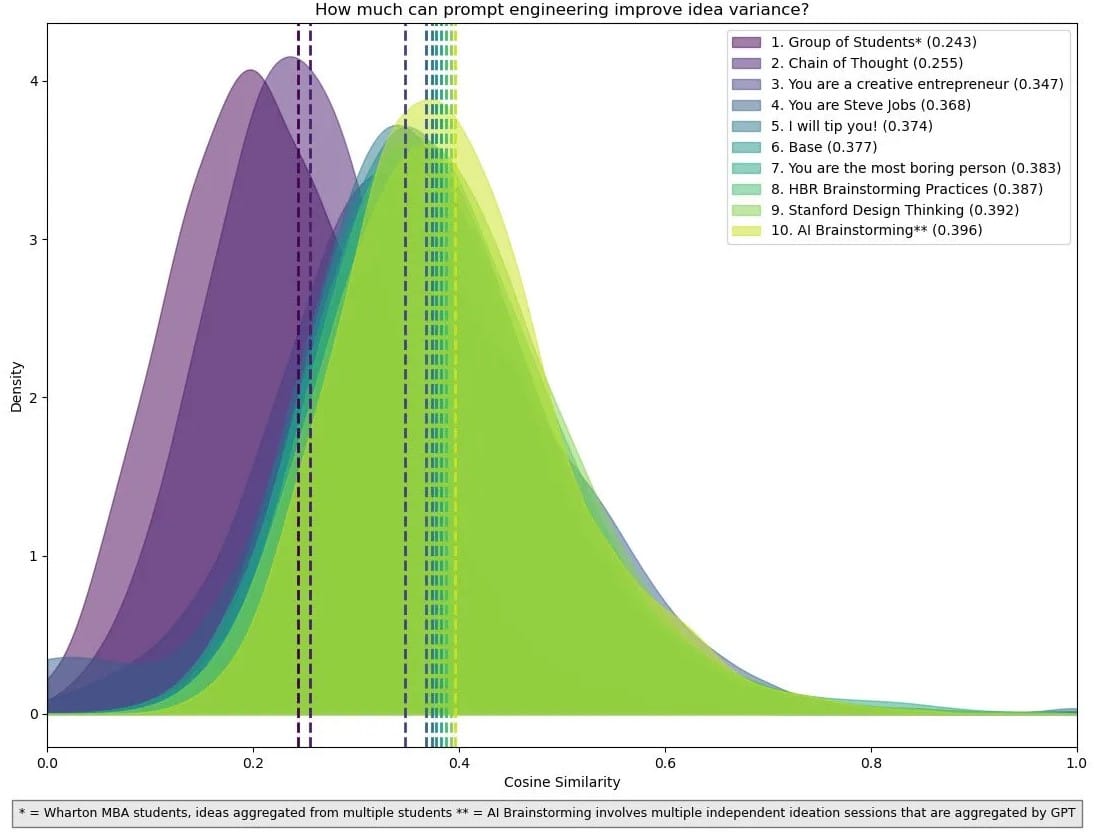 I februari publicerade professor Ethan Mollick ett paper där de hade jämfört hur kreativ ChatGPT kunde vara med olika sorters promptar. Uppdraget var att ta fram produktidéer. Människorna, i form av studenter, vann, men bara knappt före en Chain-of-Thought-prompt.