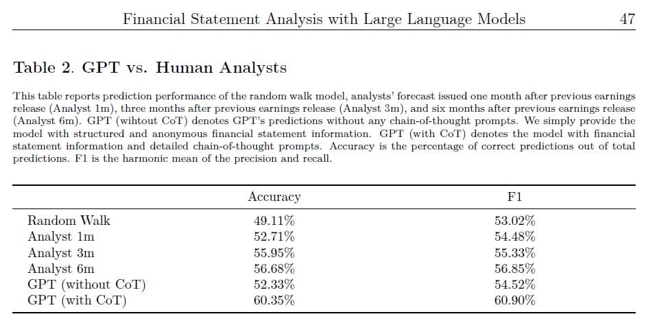 Det tar oss till idag. Nyligen publicerades ett paper av några forskare vid University of Chicago. De anonymiserade historiska finansdata från företag. Alltså hur det gått för företagen. Denna data gav de till ChatGPT, bad den göra en analys och baserat på det göra en bedömning av hur det skulle gå för företaget kommande månader.