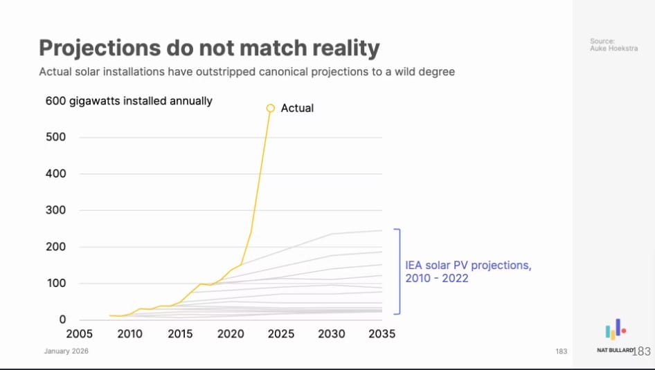 Det första han pÄpekar Àr att det inte bara Àr inom priset pÄ solenergi som prognoserna varit fel. NÀr det kommer till hur mycket solenergi som byggs, hur mÄnga batterier som sÀljs och hur mÄnga elbilar som sÀljs sÄ slÄr verkligheten gÄng pÄ gÄng prognoserna. Naam tror att prisutvecklingen fortsÀtter och bÄde för solenergi och batterier minskar med 75-80 procent de kommande 25 Ären.