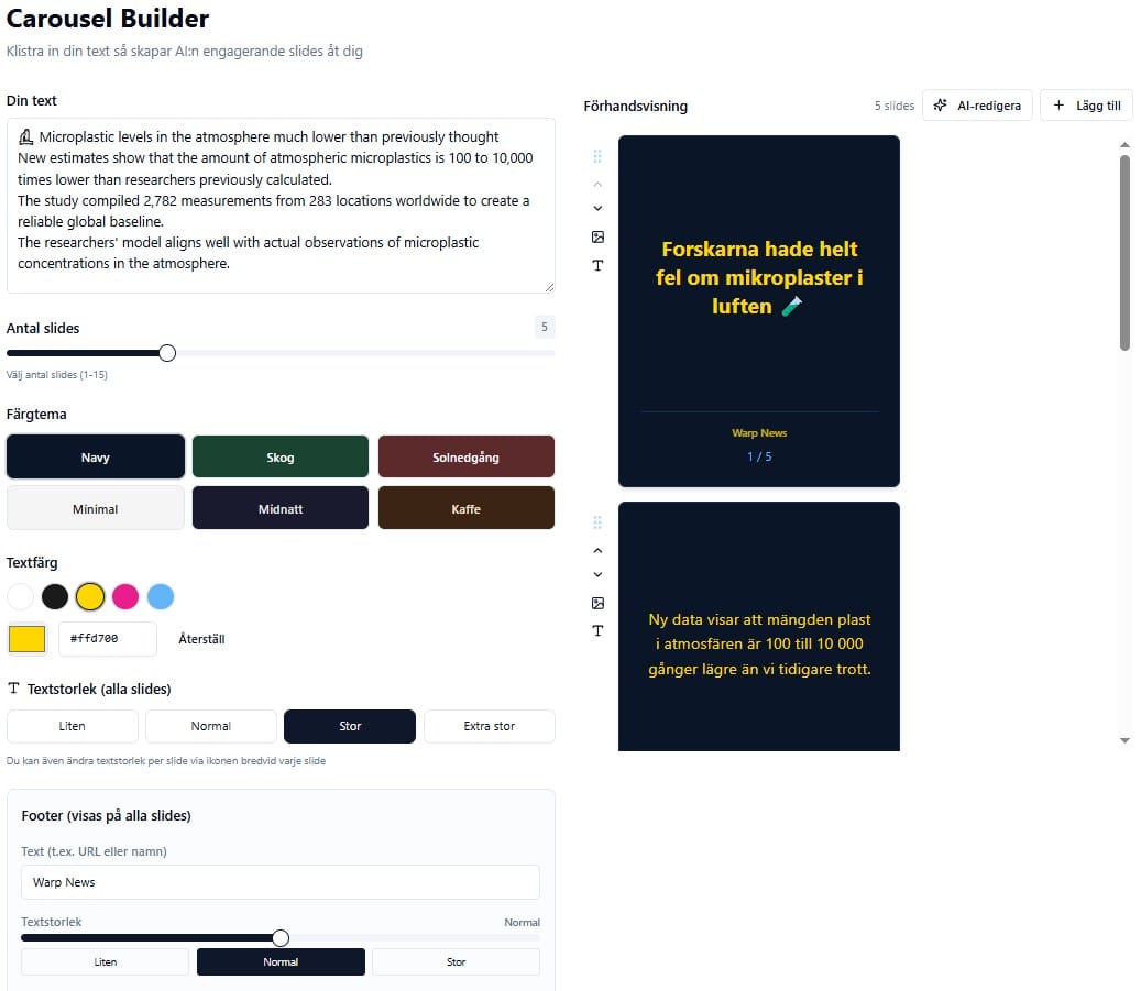 Nu har jag en egenbyggd "carousel maker" dĂ€r jag klistrar in en text och ut ploppar ett gĂ€ng bilder. Jag kan vĂ€lja hur mĂ„nga bilder, kan lĂ€gga till logga, footer, vĂ€lja fĂ€rger, ladda upp bilder, redigera direkt eller med AI, Ă€ndra ordningen pĂ„ bilderna, ta bort eller lĂ€gga till bilder â och sĂ„ vidare.