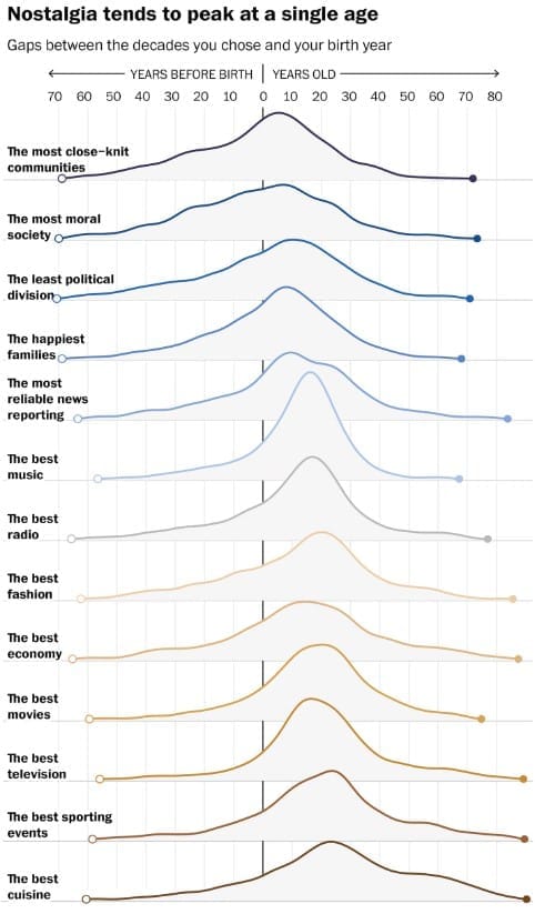 Varje generation tror att nÀr vi de var tonÄringar hade samhÀllet mest gemenskap, var mest moraliskt, hade den minsta politiska polariseringen, de lyckligaste familjerna, den mest tillförlitliga nyhetsrapporteringen, den bÀsta musiken, den bÀsta radioprogrammen, det bÀsta modet, den bÀsta ekonomin, de bÀsta filmerna, den bÀsta tv-programmen, de bÀsta sportevenemangen och den bÀsta matkulturen.