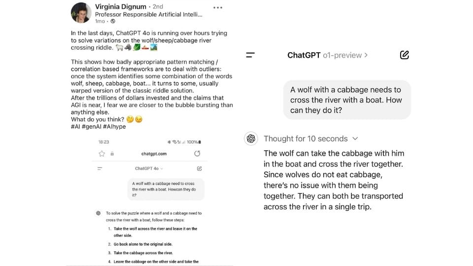 TrÀd: En AI-professor dissar generativ AI och menar att vi Àr nÀra att bubblan spricker, eftersom ChatGPT inte klarar att lösa en enkel gÄta: "En varg och ett kÄlhuvud behöver ta sig över en flod med en bÄt. Hur dÄ?"