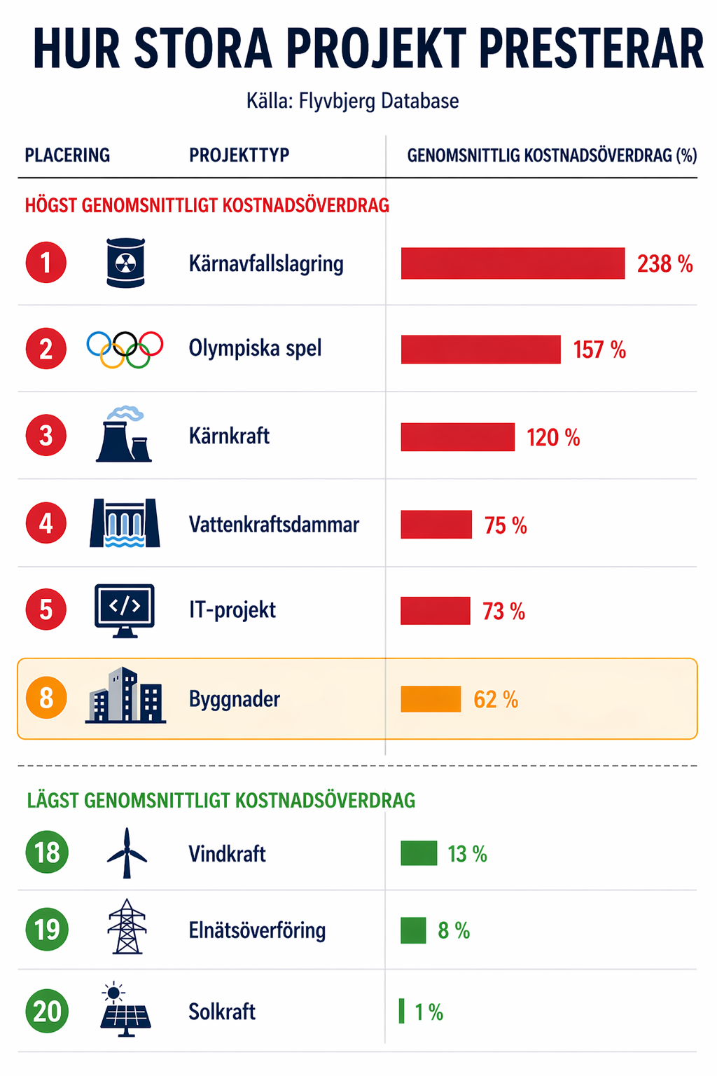 Enligt professor Bent Flyvbjerg, som sammanstÀllt stora projekt i en databas, sÄ Àr kÀrnavfallslagring, OS, kÀrnkraft, vattendammar och IT vÀrst nÀr det kommer till att dra över budget.
