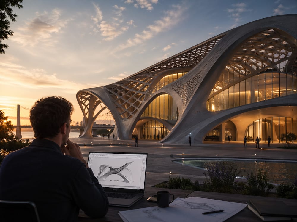 "Jag tror att arkitekturen kommer att se vÀldigt annorlunda ut framöver. I dag bygger vi mest med rÀta vinklar, vilket hÀnger ihop med byggmetoder som stolp- och balksystem, utvecklade för lÀnge sedan, dÀr lasten förs ner vertikalt via balkar.
