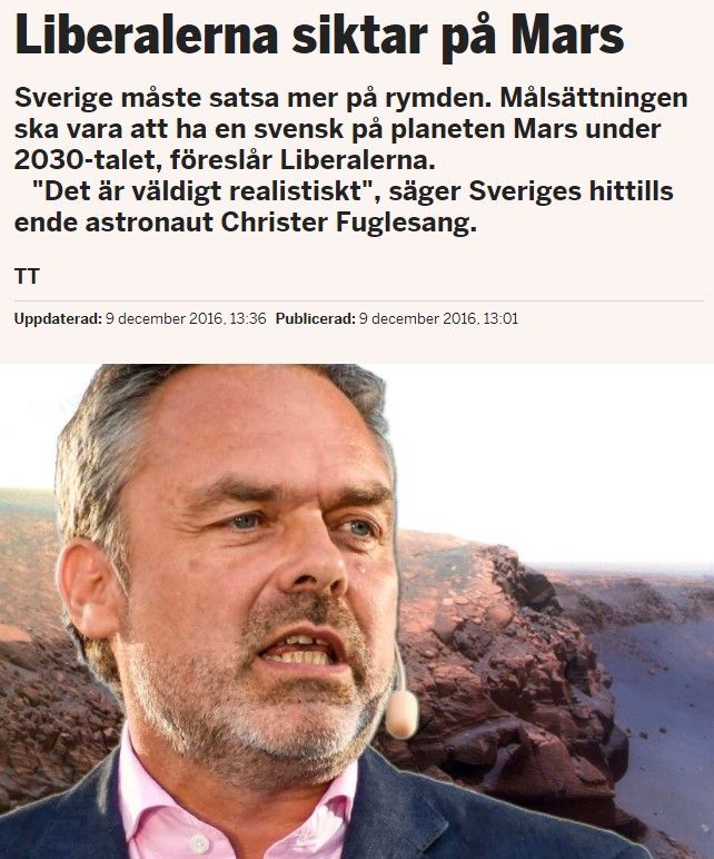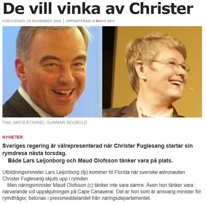 Senast en rymdminister var pÄ tÄrna var 2006 dÄ Christer Fuglesang Äkte till rymden. BÄde Lars Leijonborg, som var rymdminister, och Maud Olofsson, nÀringsminister som menade att hon ocksÄ var typ rymdminister, kastade sig bÄda pÄ flyget till Cape Canaveral. Sedan dess har inte sÄ mycket hÀnt frÄn politiken.